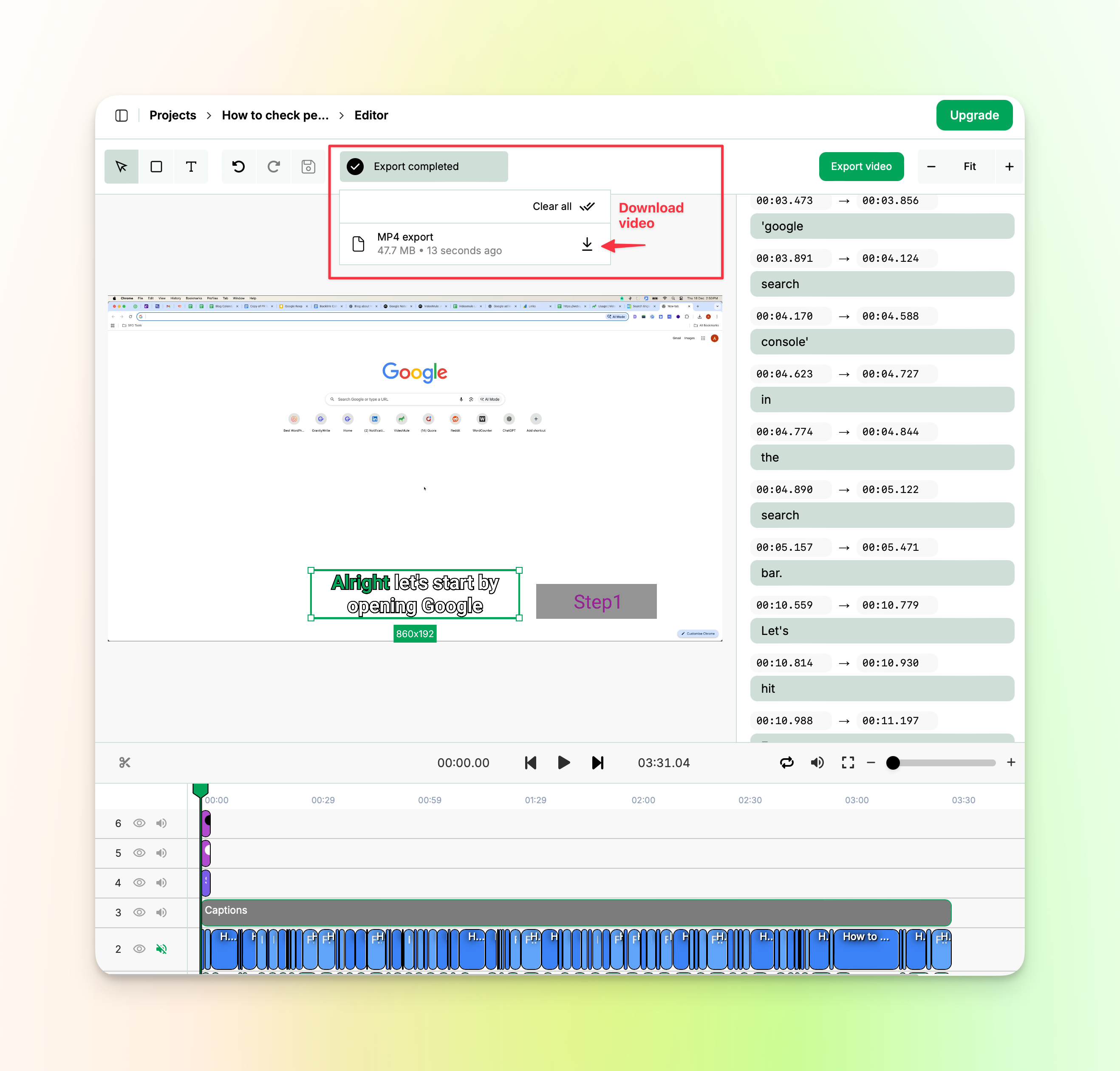 When the render completes, you'll see a download button. Click it to save the video file directly to your computer or device.