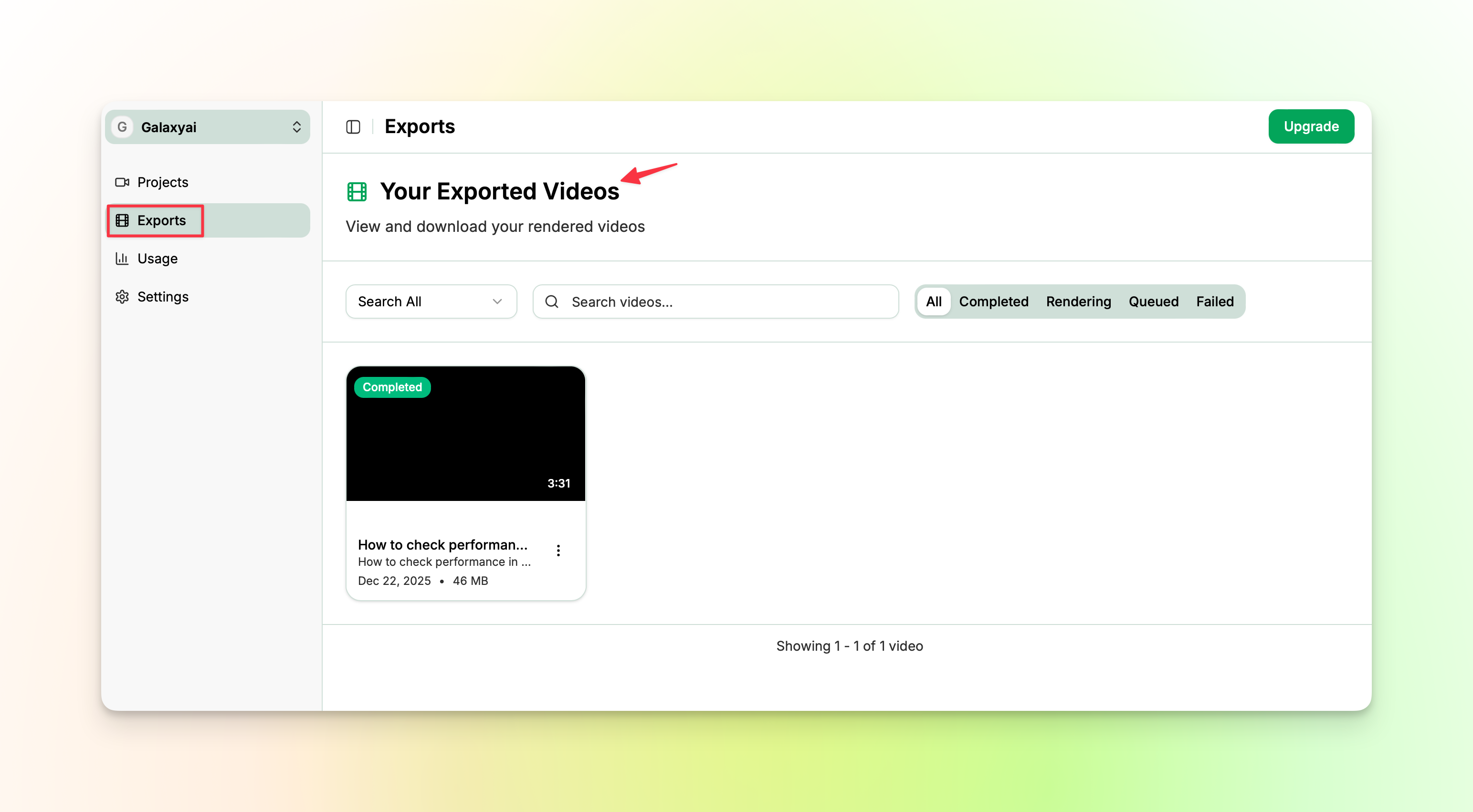 From the Exports tab you can view all your past rendered videos in one list, download any video again without opening the original project, rename your exported files for better organization, and delete old exports you no longer need.